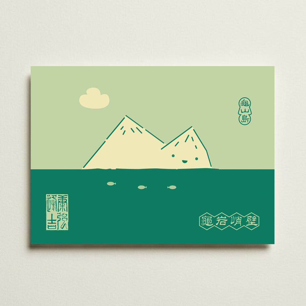 你知道嗎?台灣最大的活火山島-龜山島,如您不留意,隨時會站起來「散步」、「戴帽」、「擺尾」、「摸魚」、「吹氣球」,猶如一隻超級大龜怪!因此,我們推出「龜山龜怪」祈福明信片,把龜山八景與逗趣的龜怪完美融合。